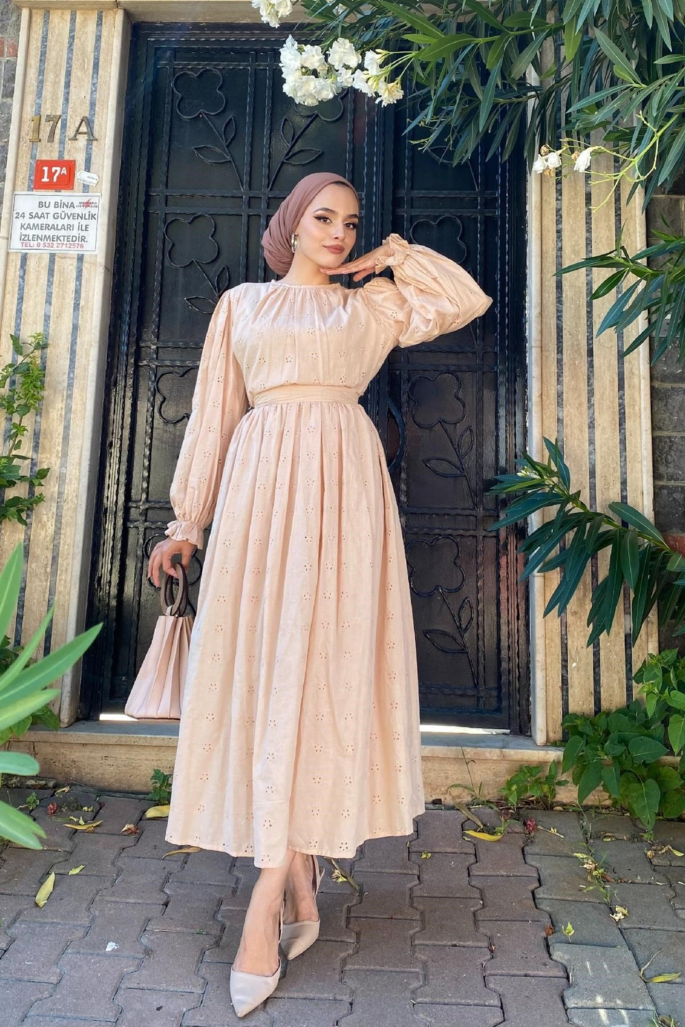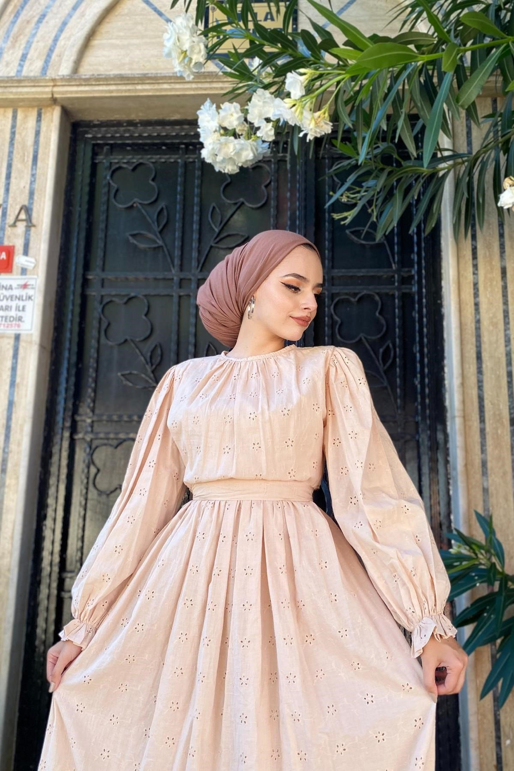 Çiçek Desenli Güpür Elbise Bej