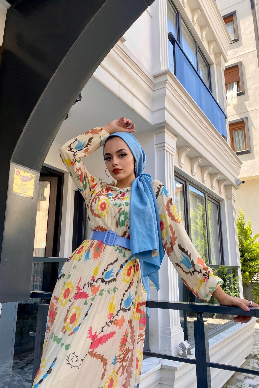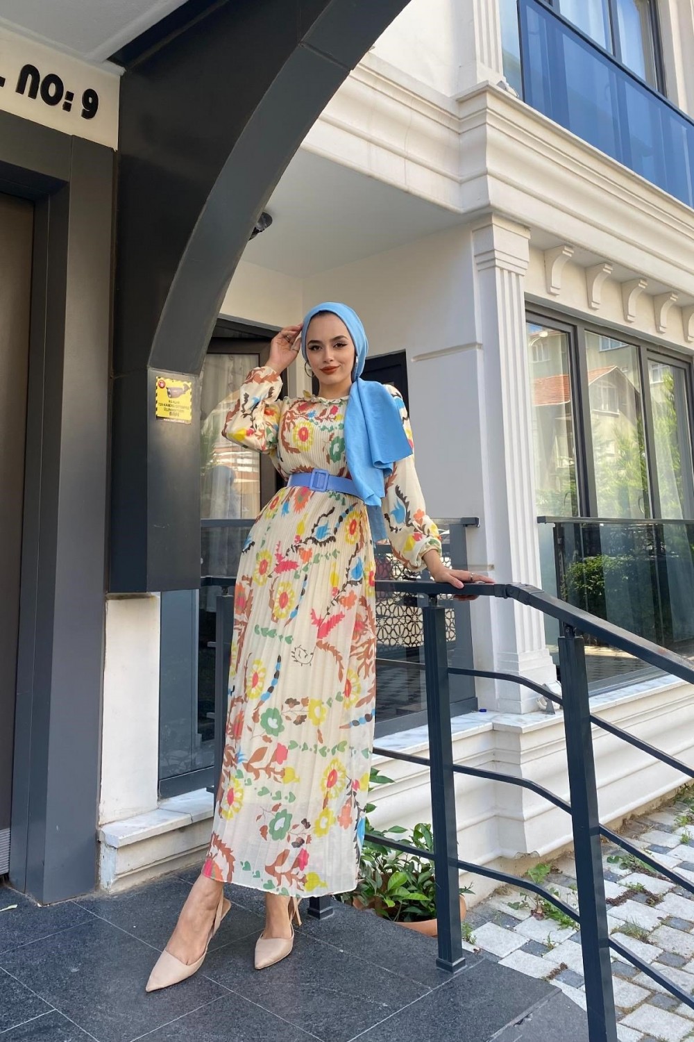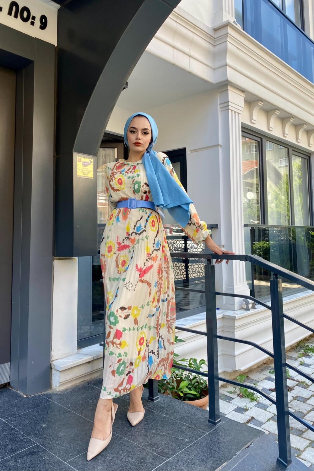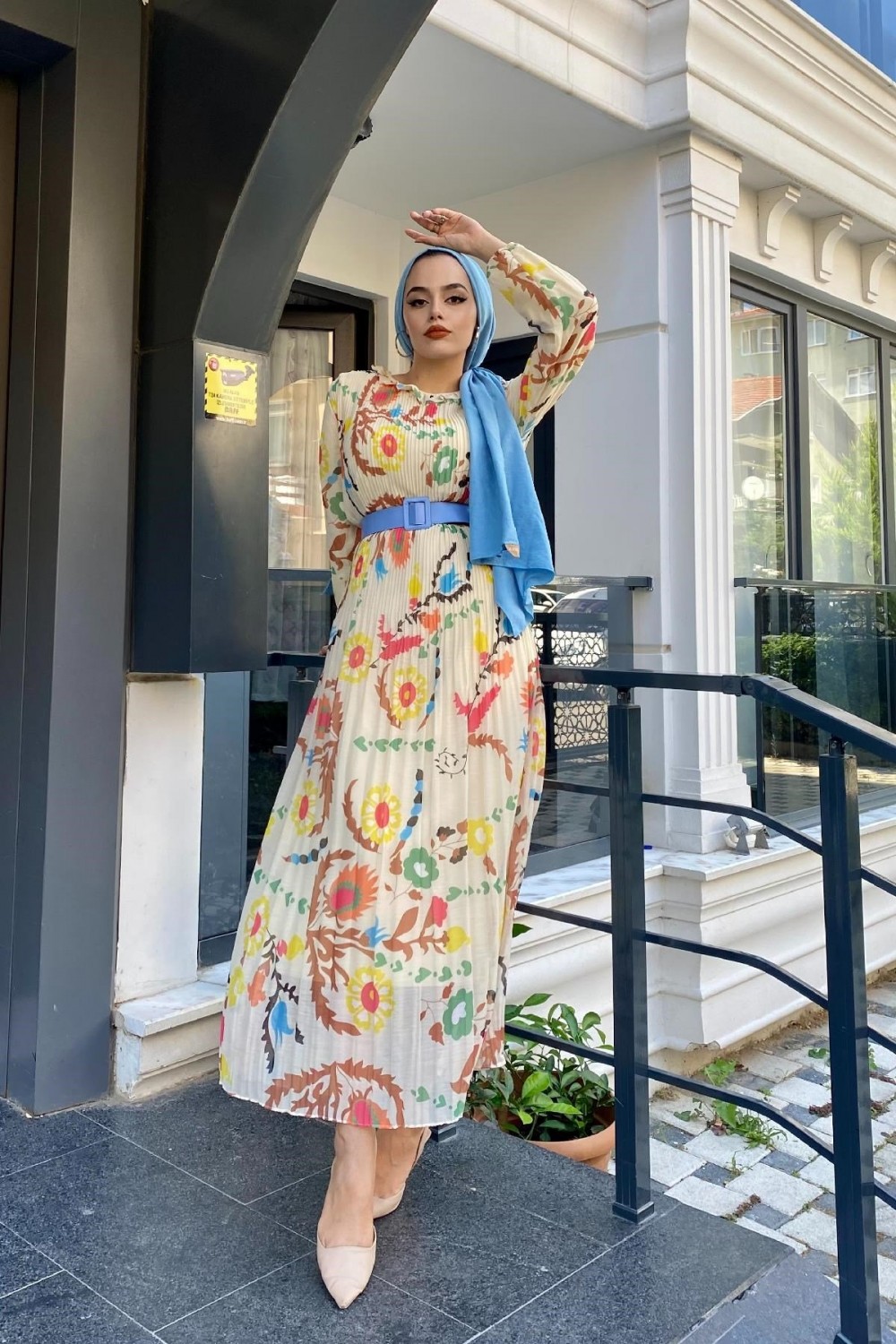 Desenli Sık Piliseli Elbise Bej