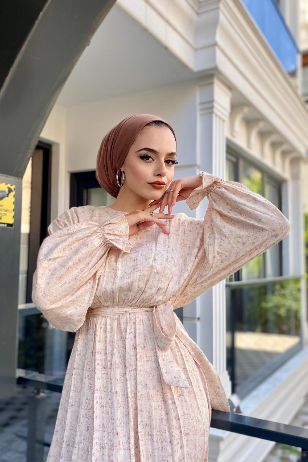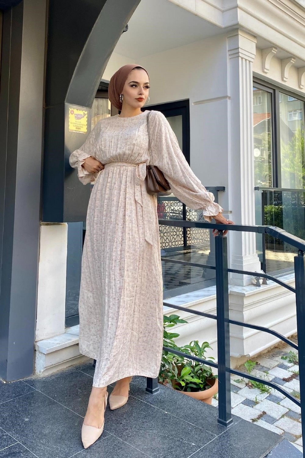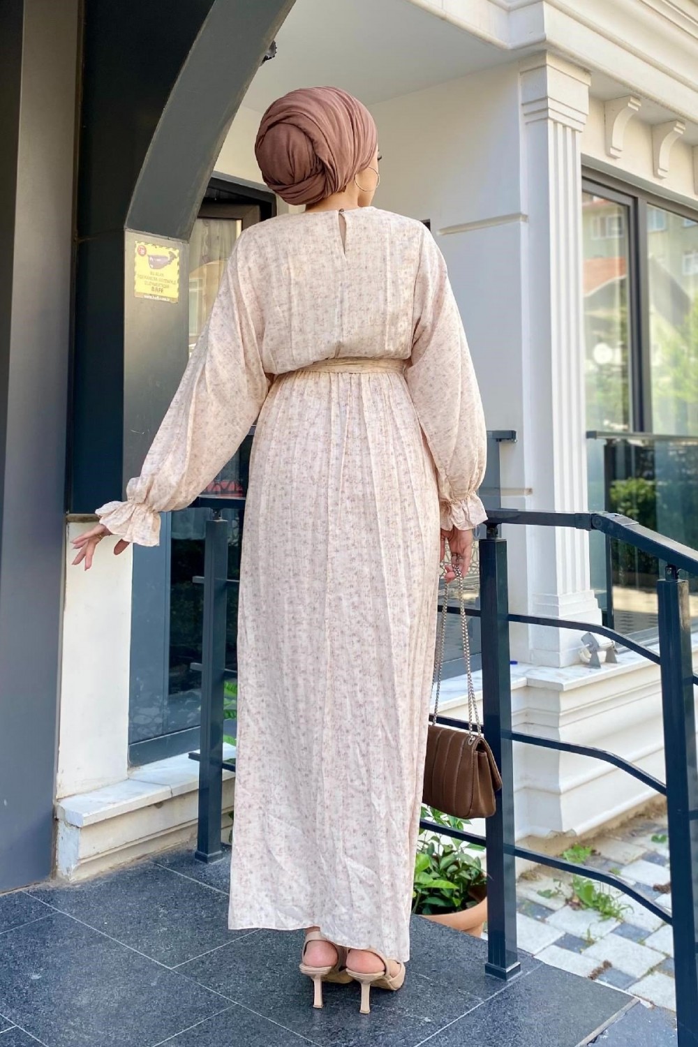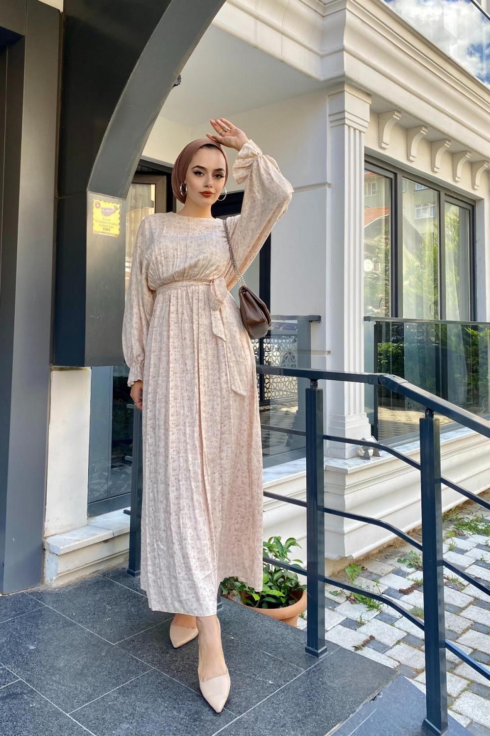 Kolu ve Beli Lastikli Renkli Elbise Bej
