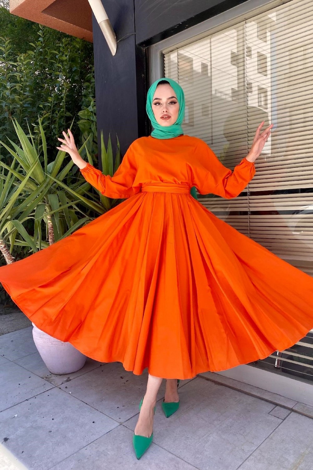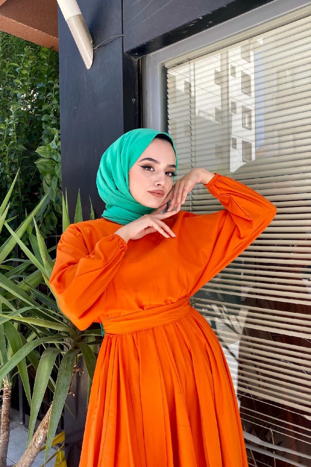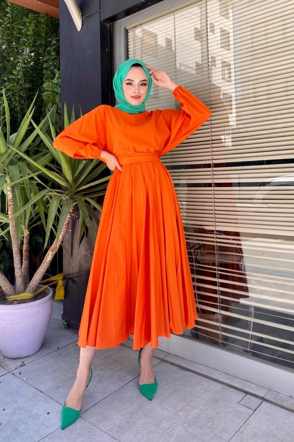 Beli Lastikli Tesettür Elbise Turuncu