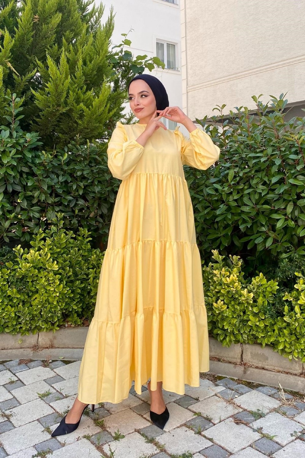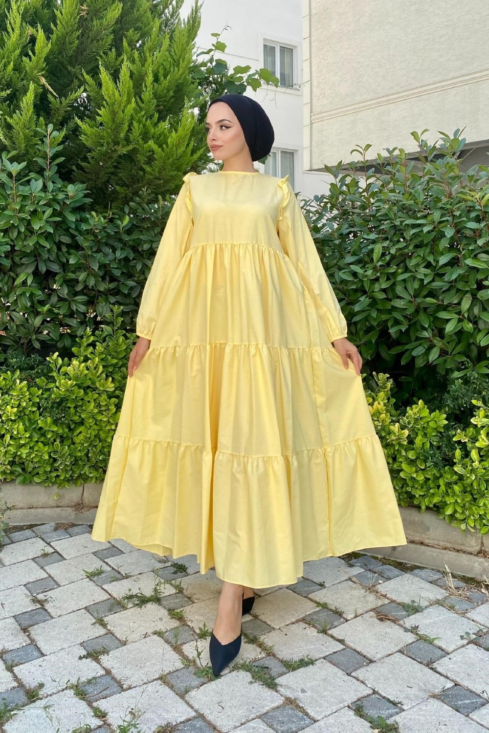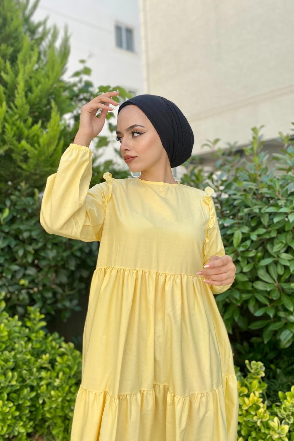 Kolu Fırfırlı Poplin Tesettür Elbise Sarı