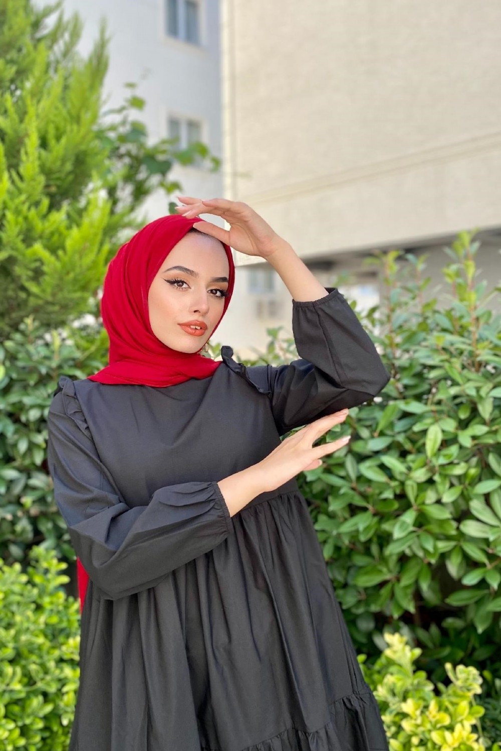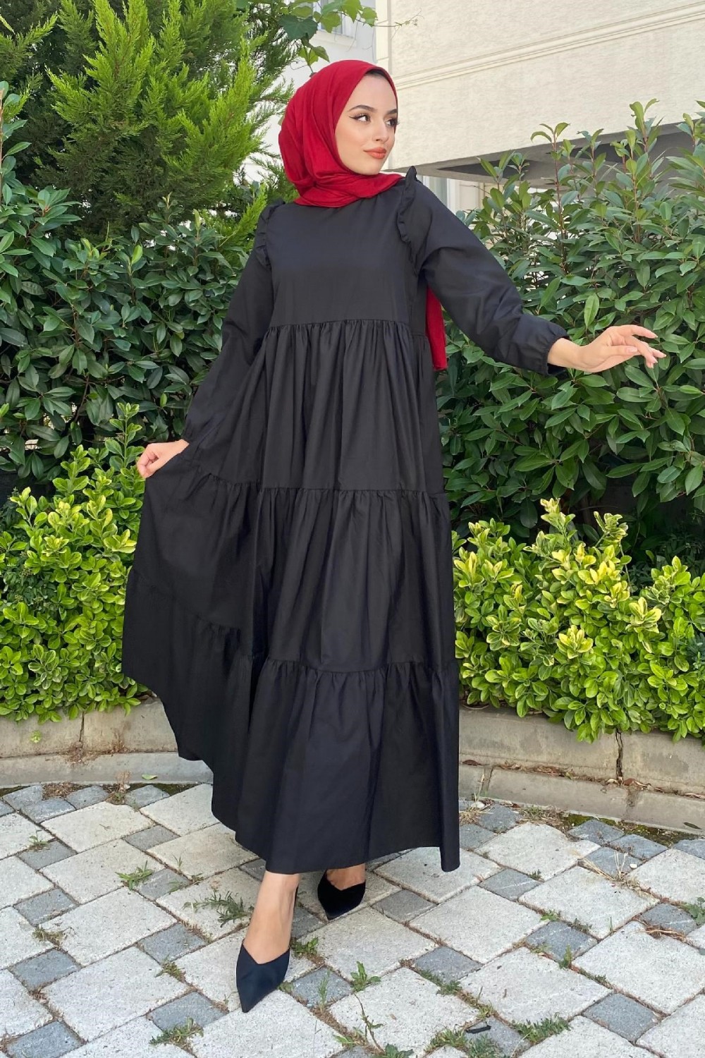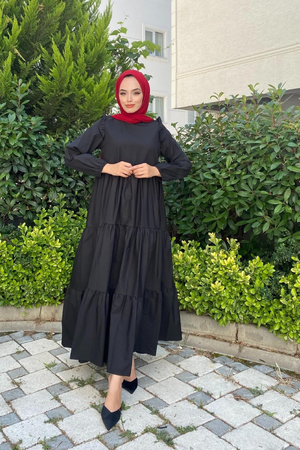 Kolu Fırfırlı Poplin Tesettür Elbise Siyah