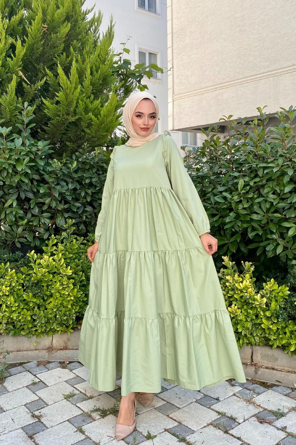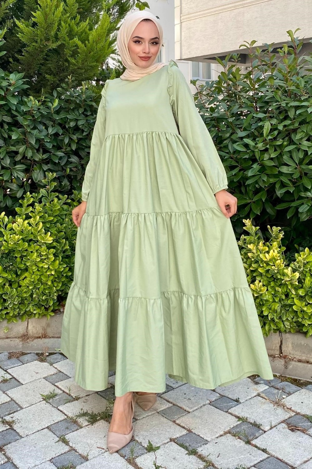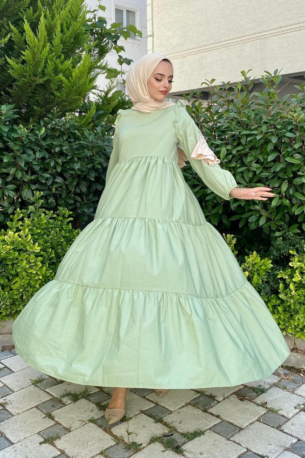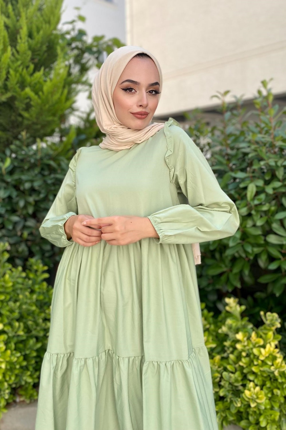Kolu Fırfırlı Poplin Tesettür Elbise Mint