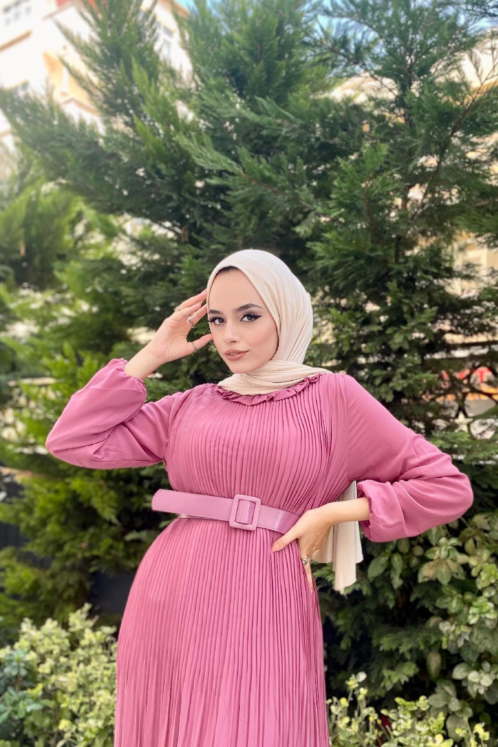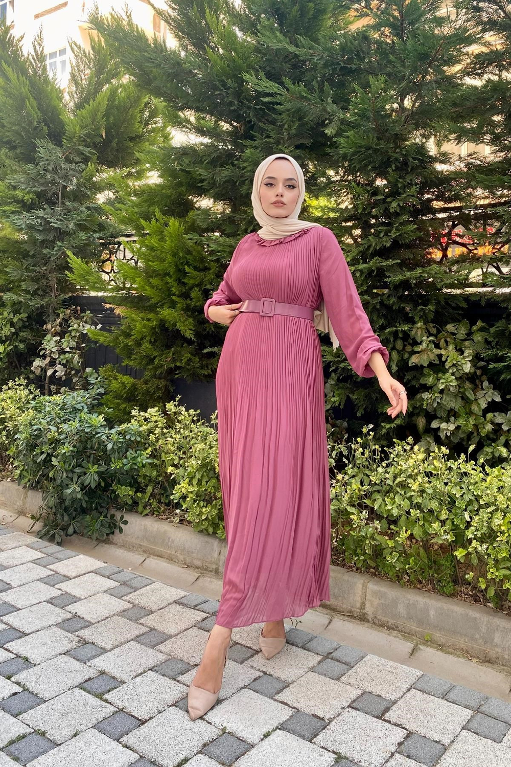 Sık Piliseli Şifon Elbise Gül