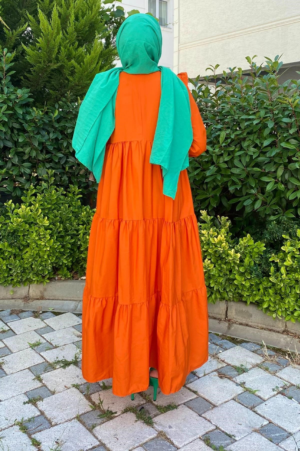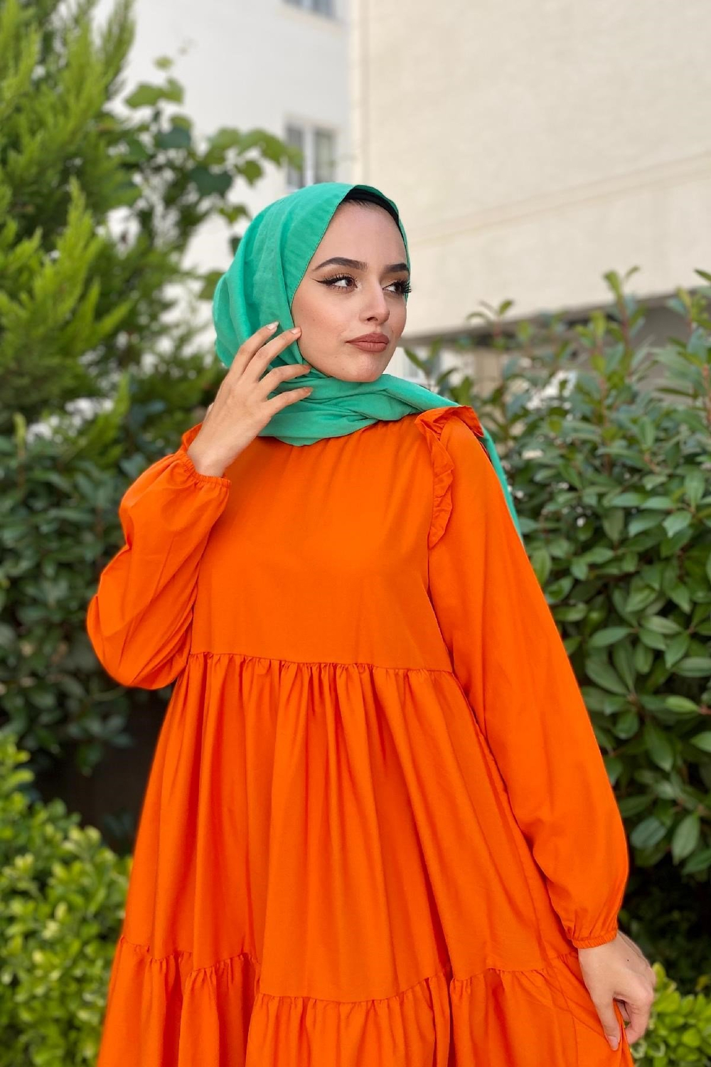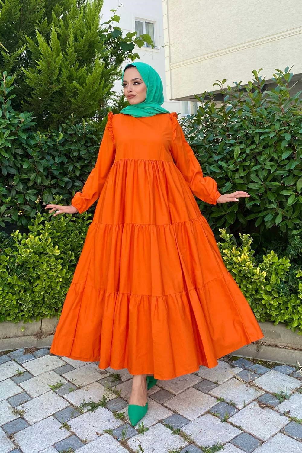 Kolu Fırfırlı Poplin Tesettür Elbise Turuncu