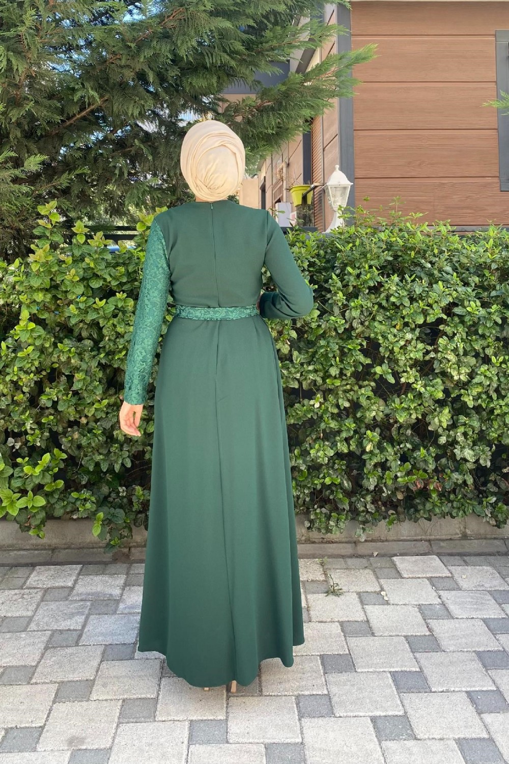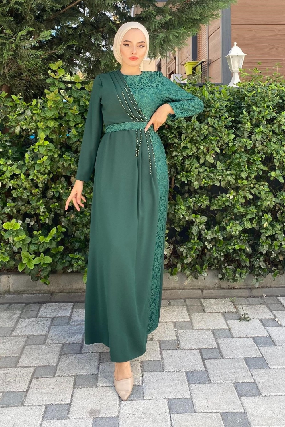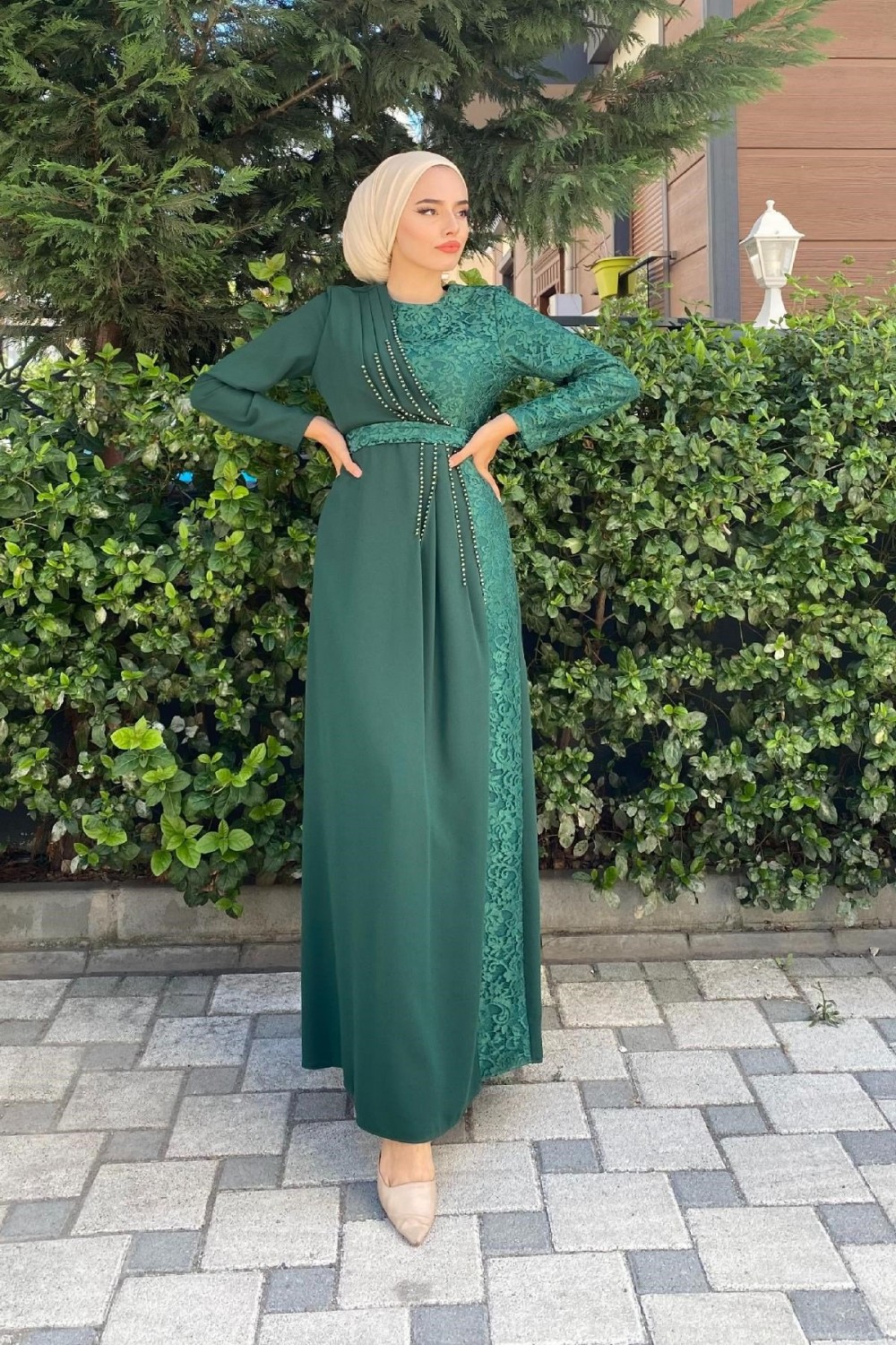 Gögsü İşlemeli Dantel Abiye Yeşil
