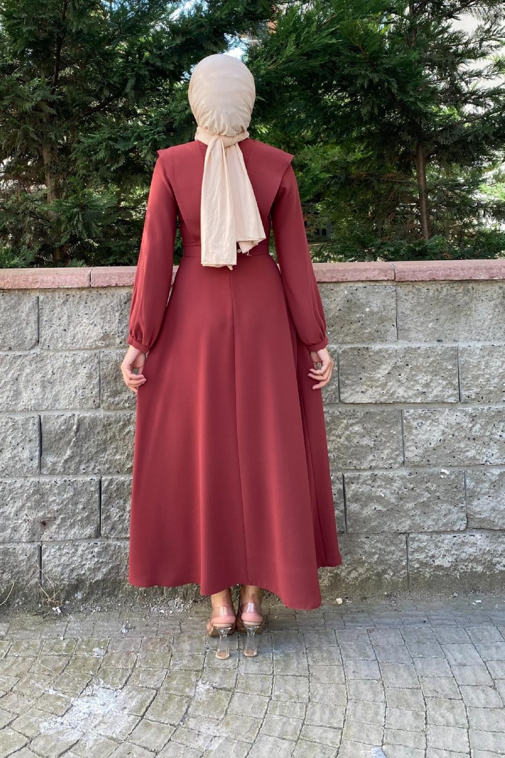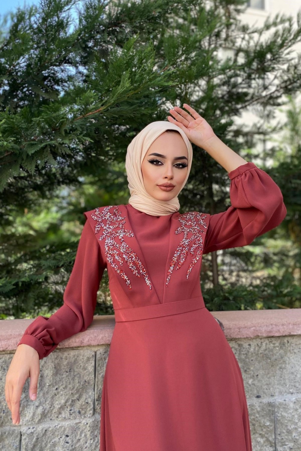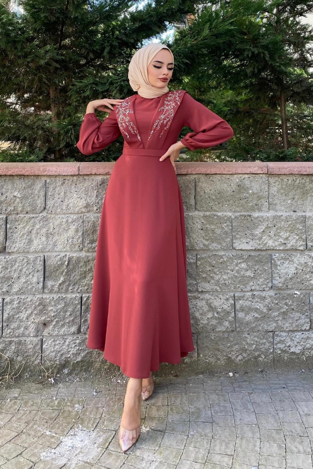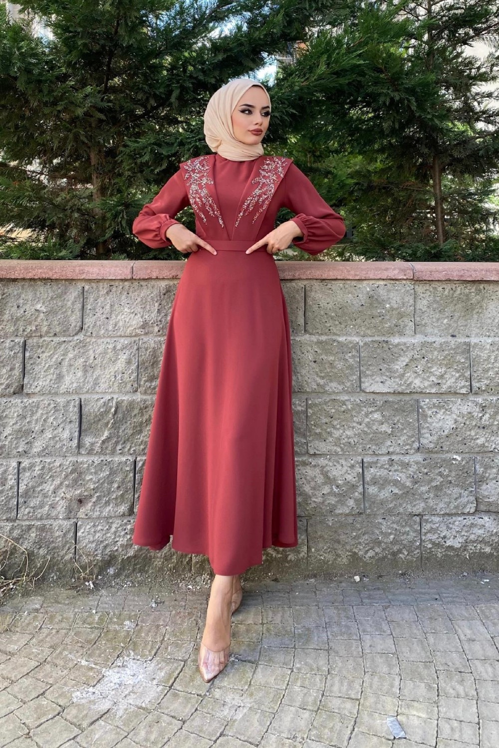 Önü Taşlı Kemerli Elbise Kiremit