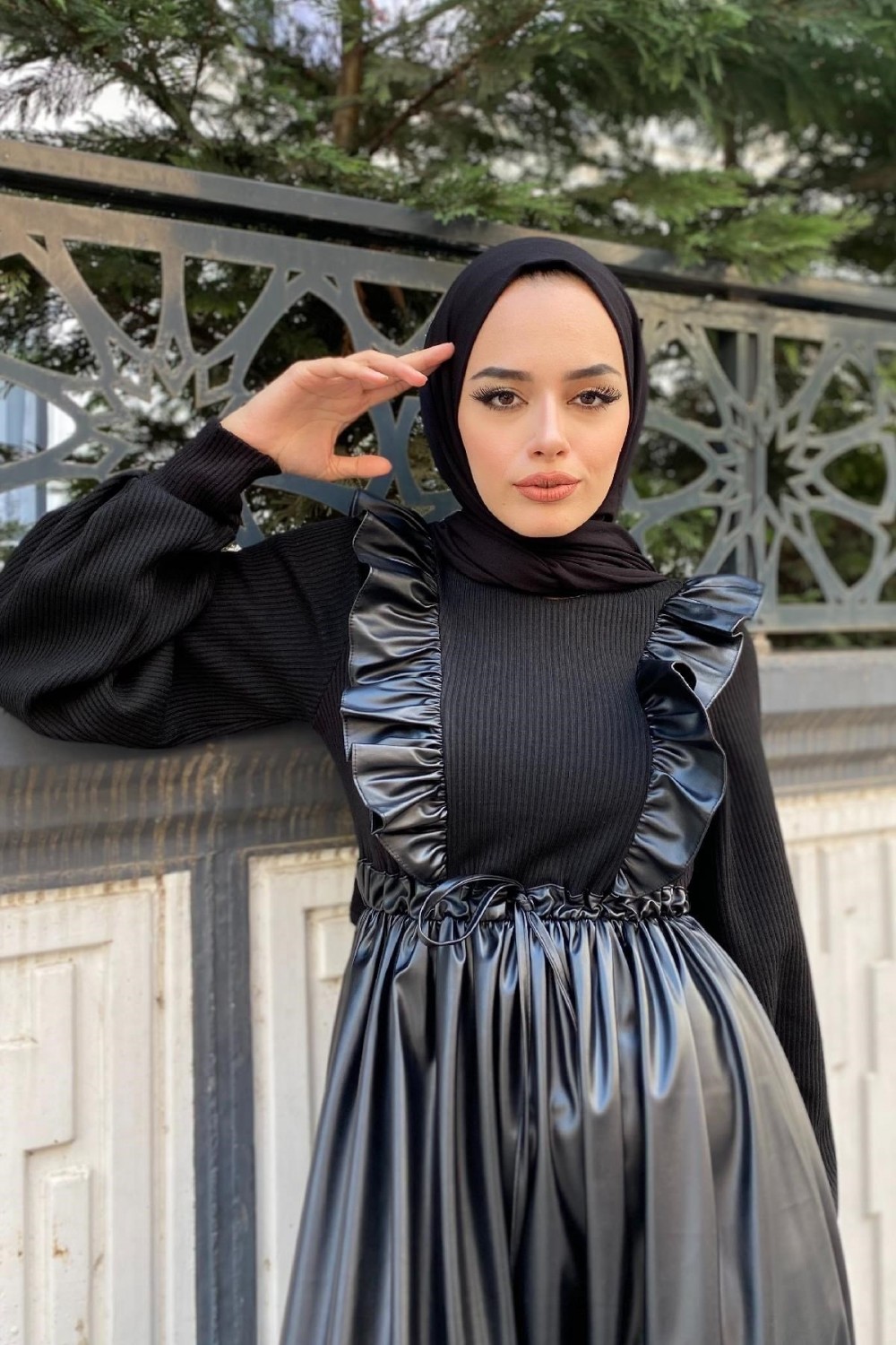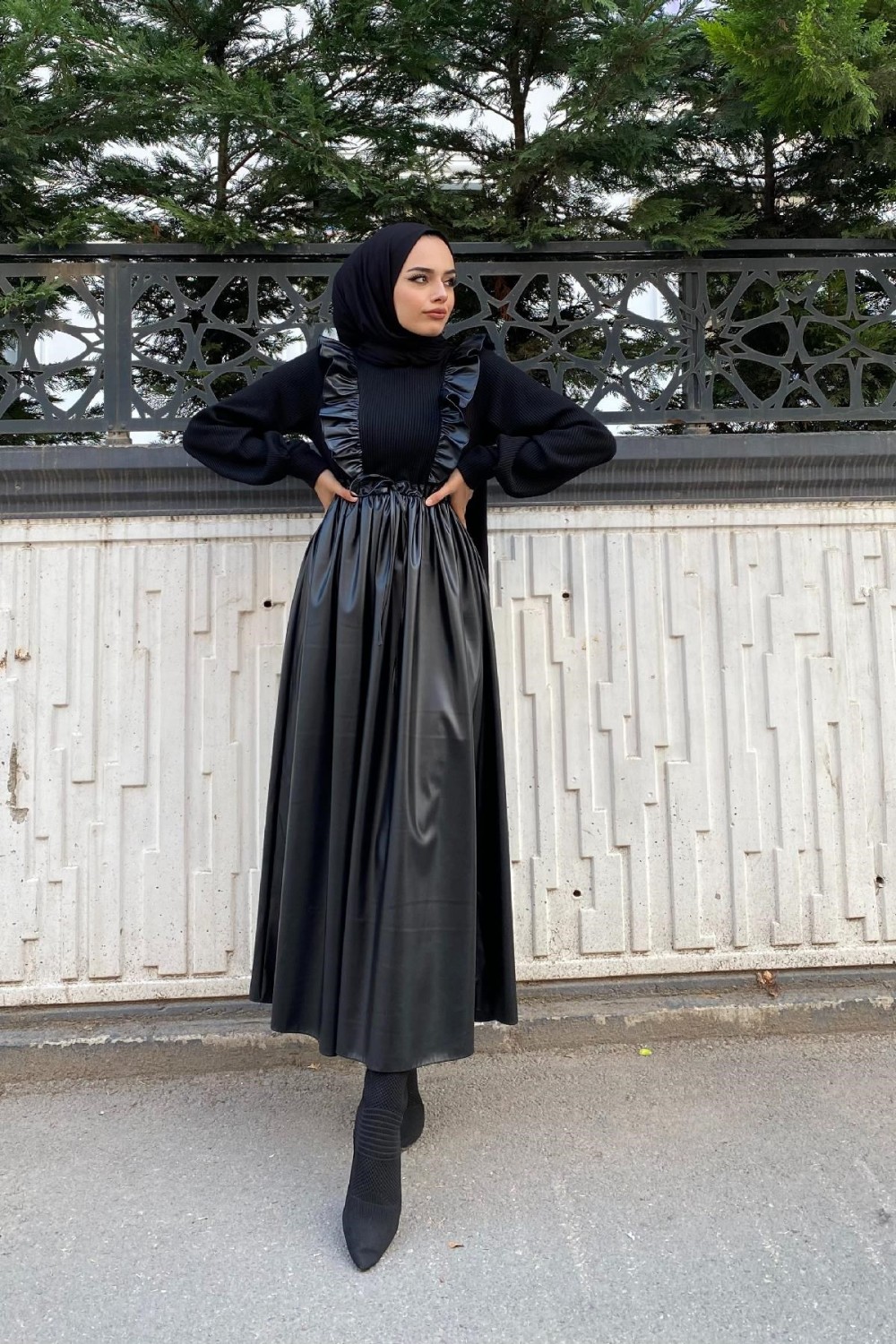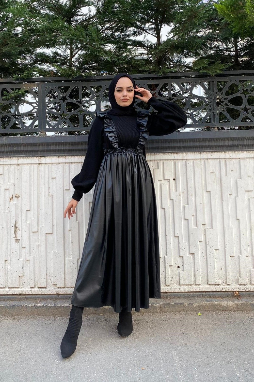 Önü Fırfırlı Derili Elbise Siyah