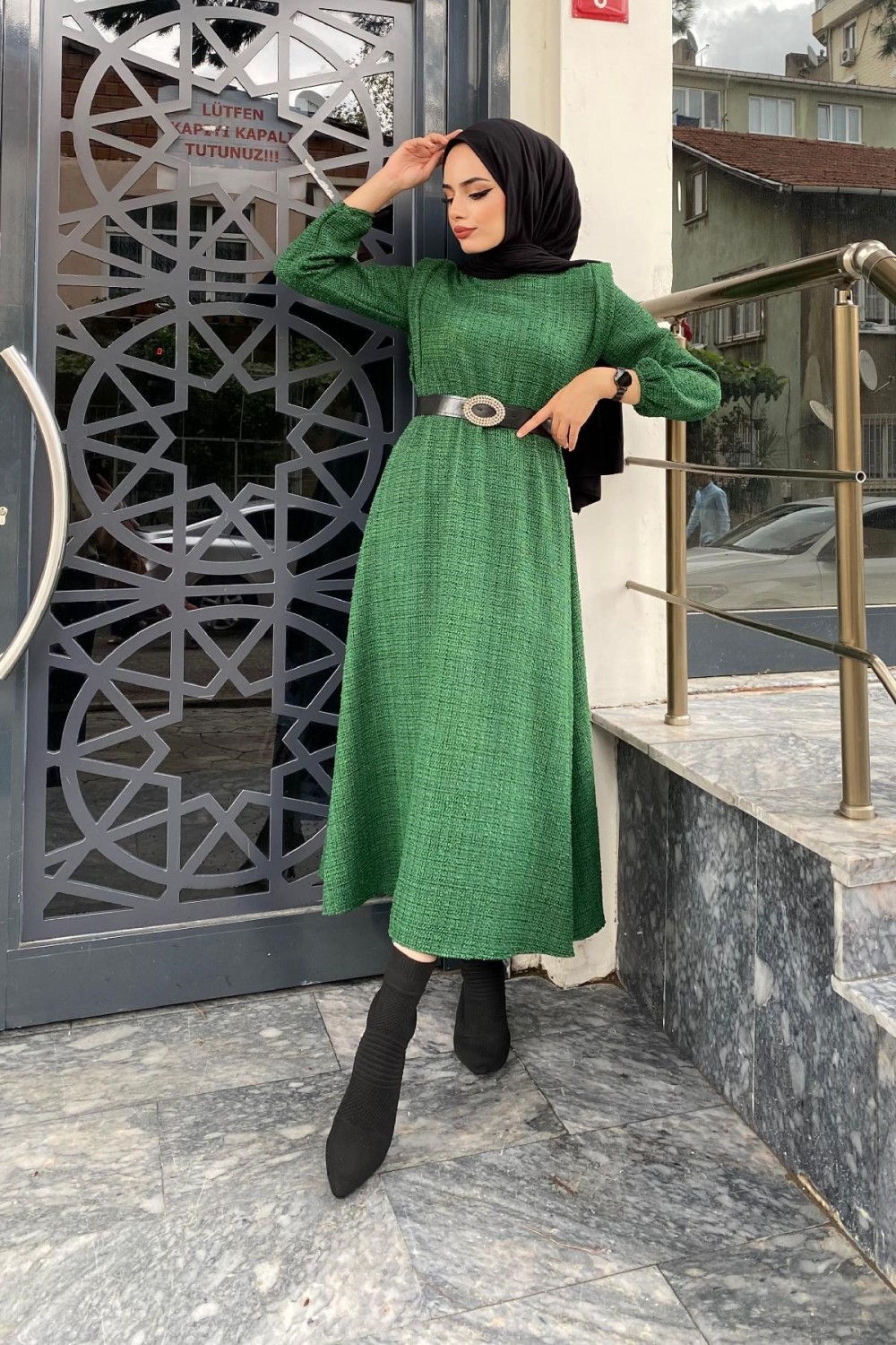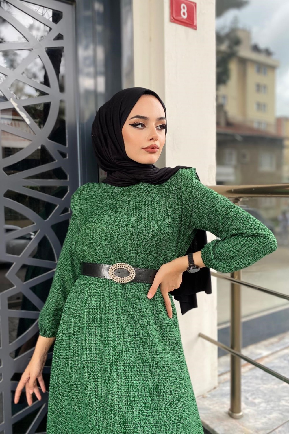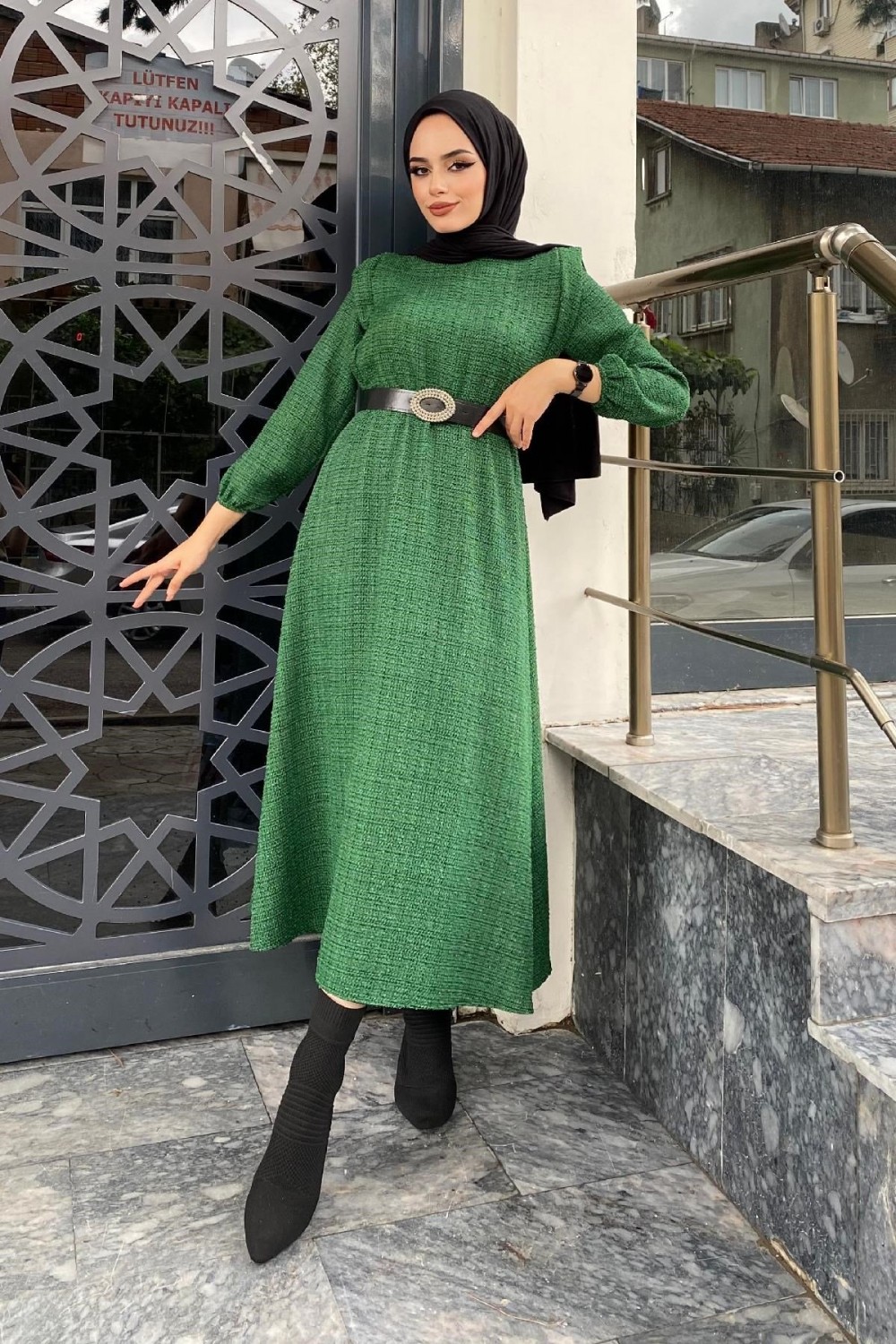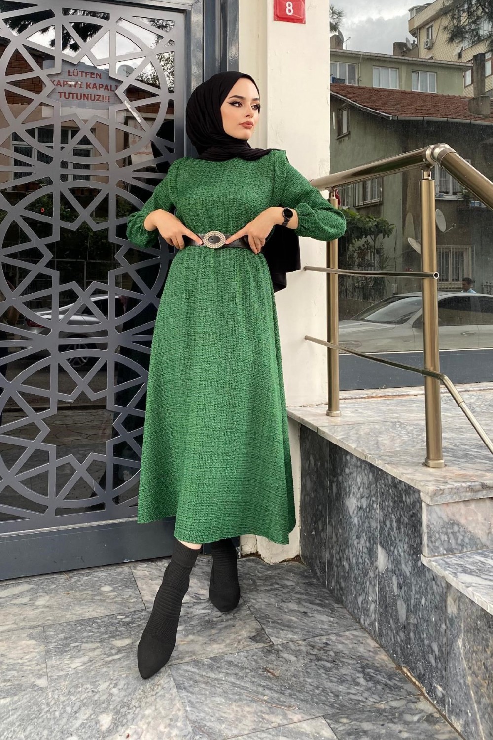 Beli Lastikli Kemerli Elbise Yeşil