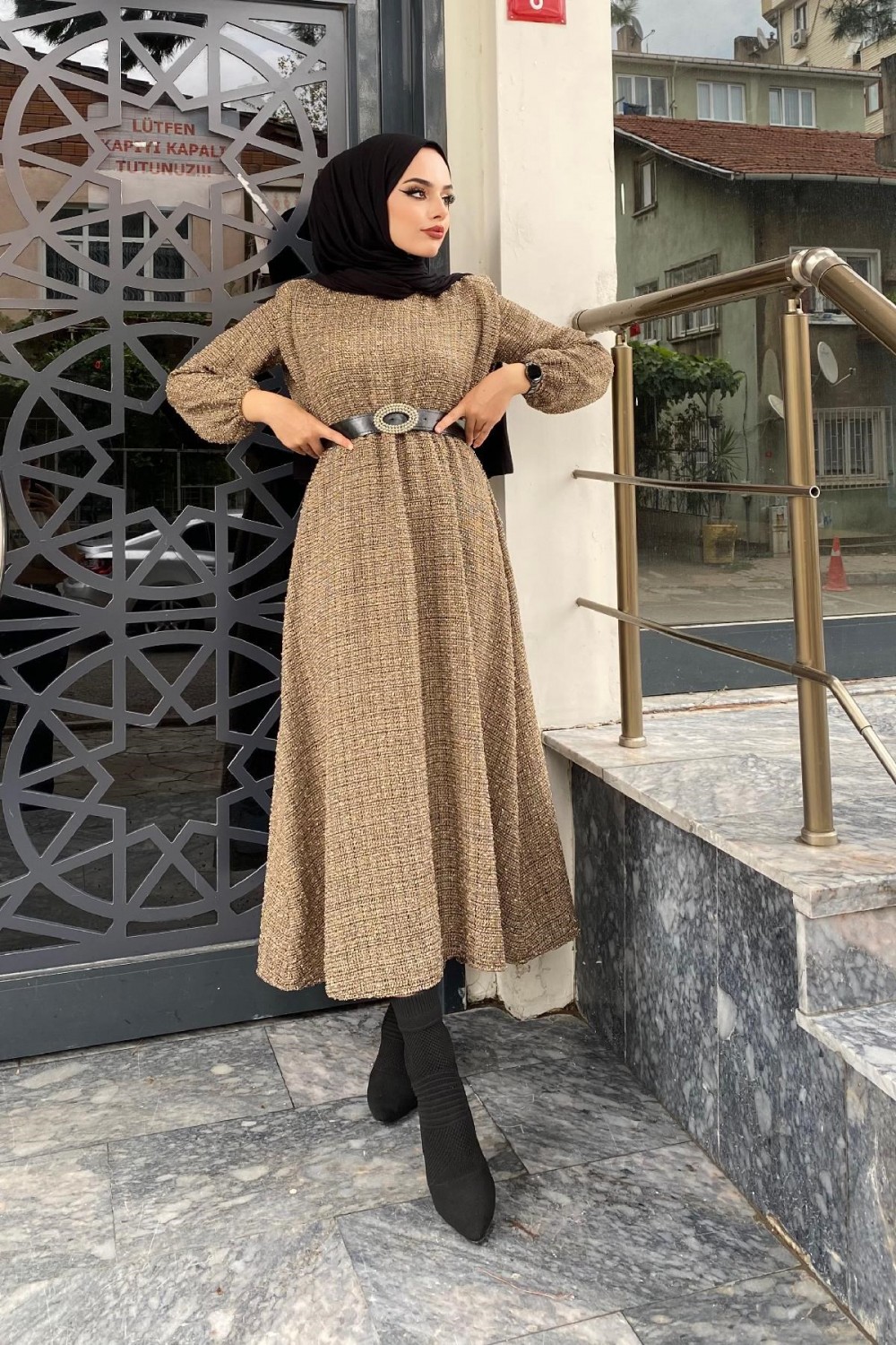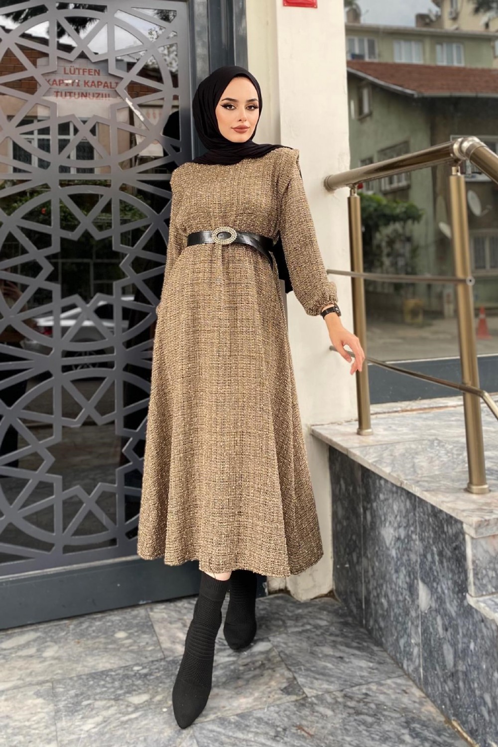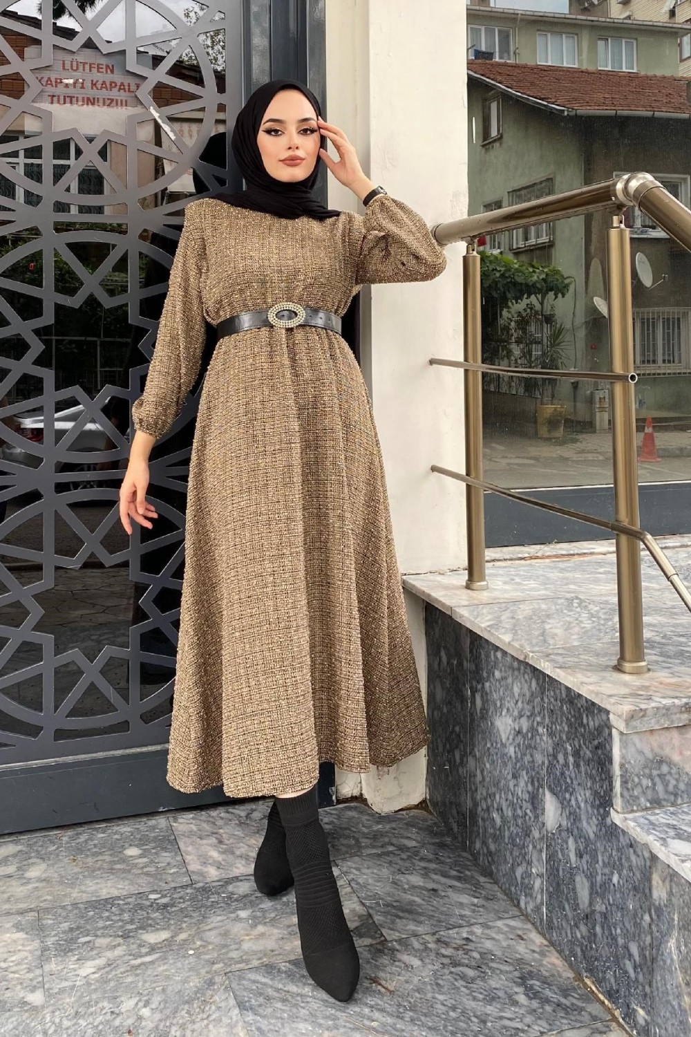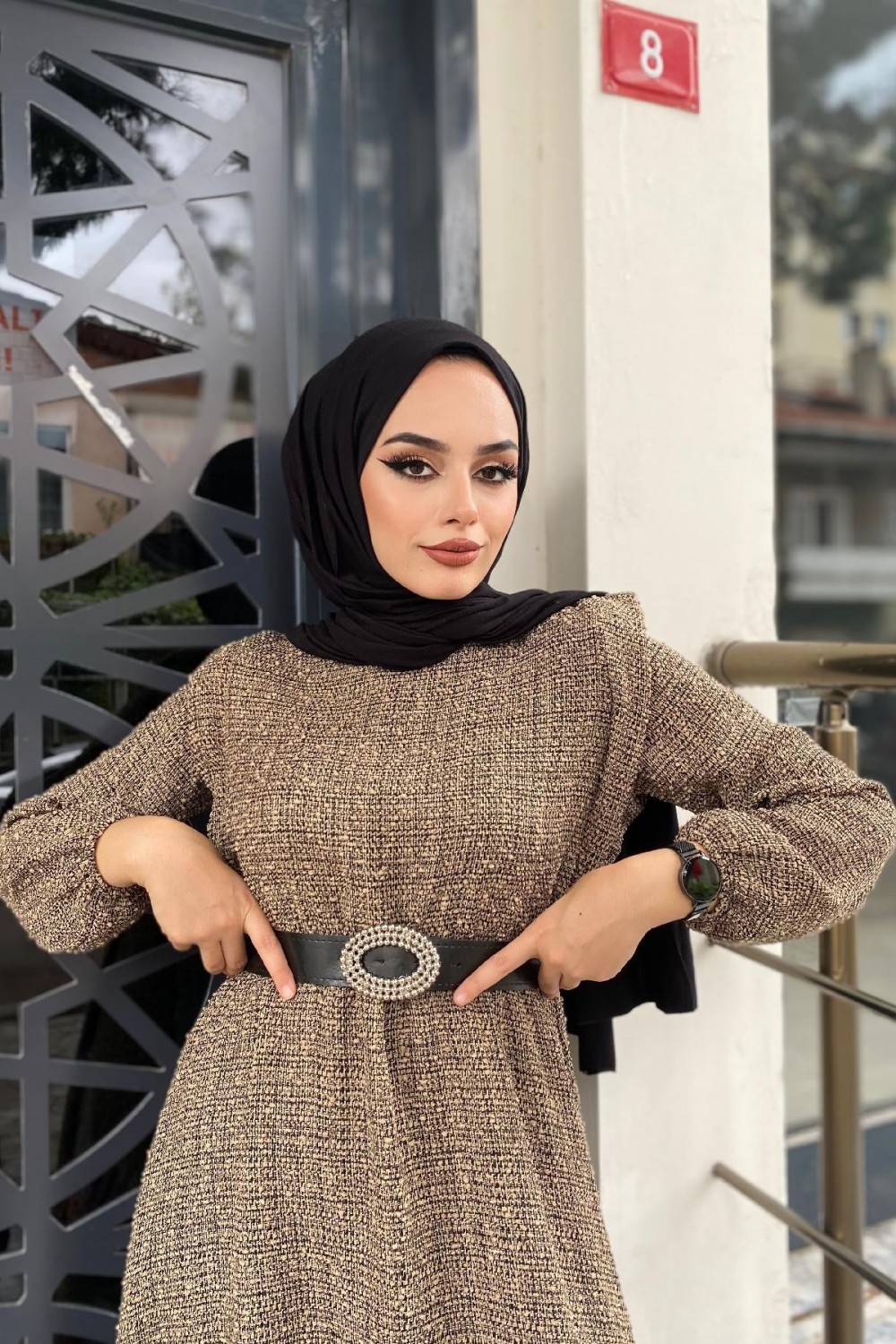 Beli Lastikli Kemerli Elbise SütlüKahve
