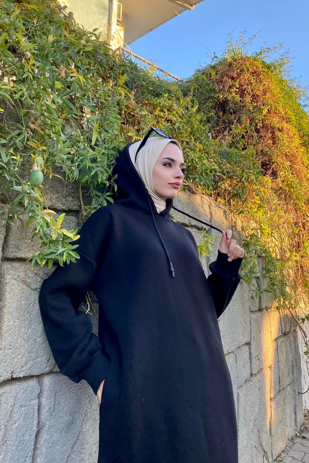Kapşonlu Volanlı Elbise Siyah