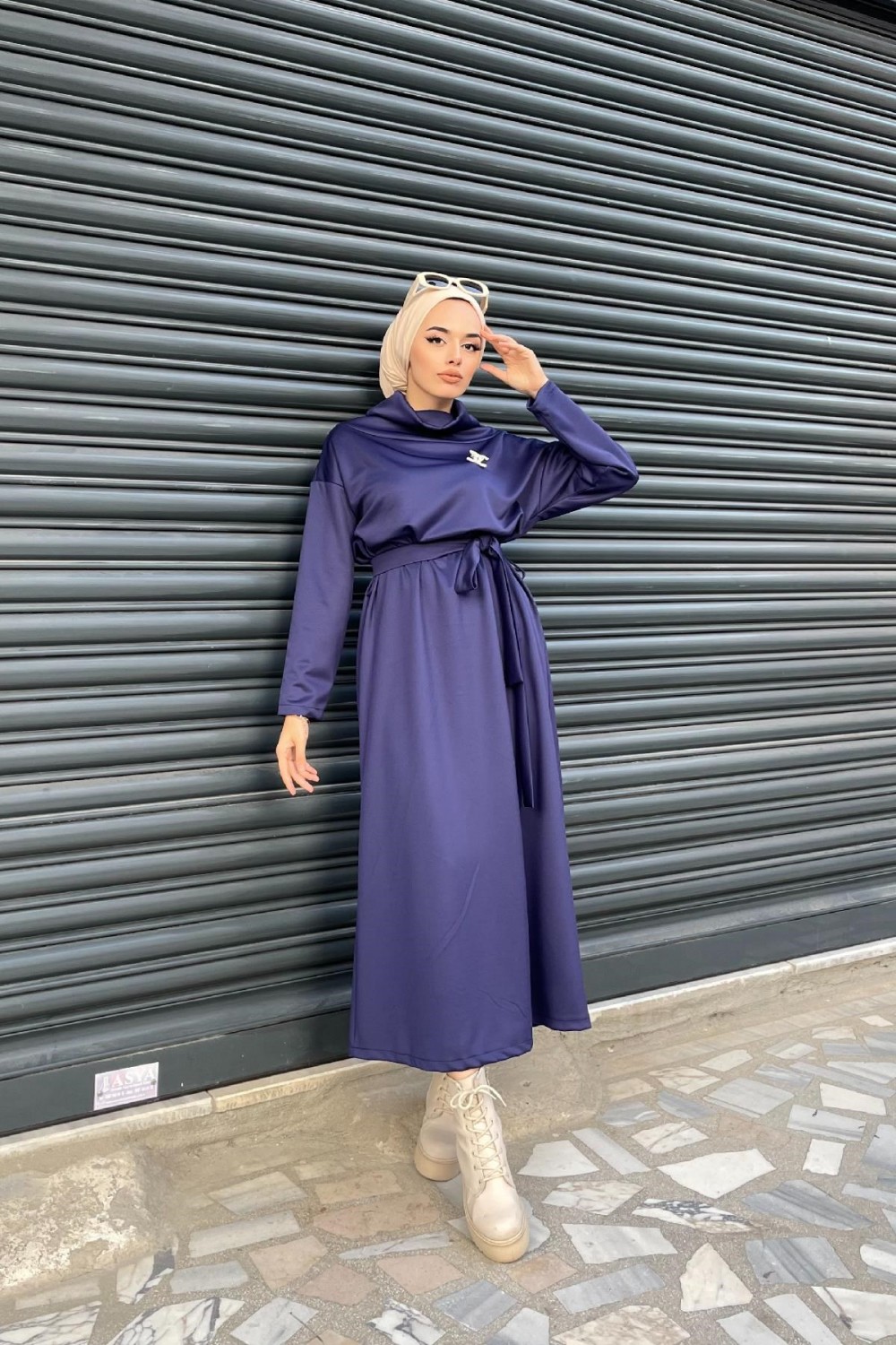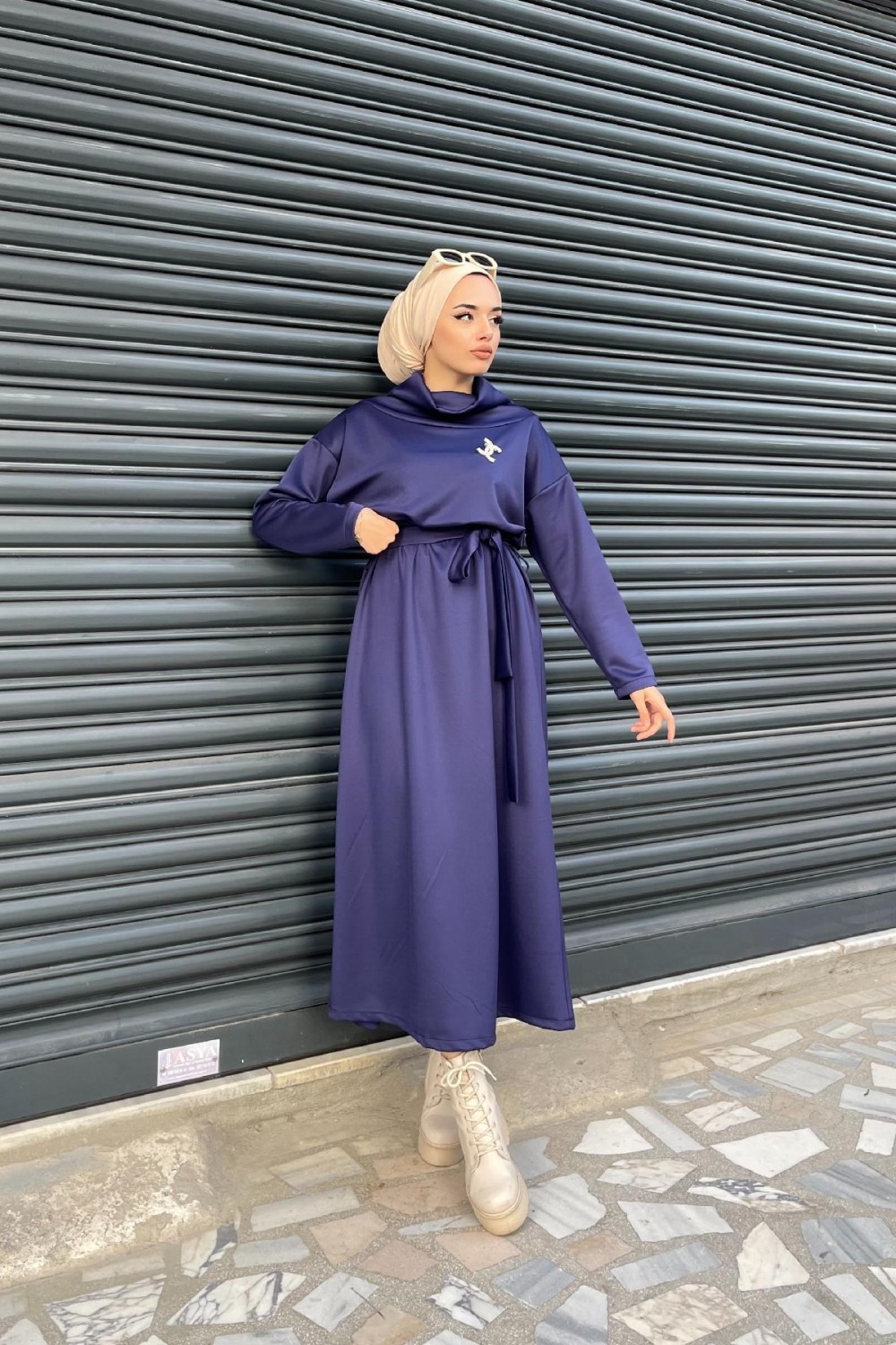 Boğazı Dökümlü Scuba Elbise Lacivert