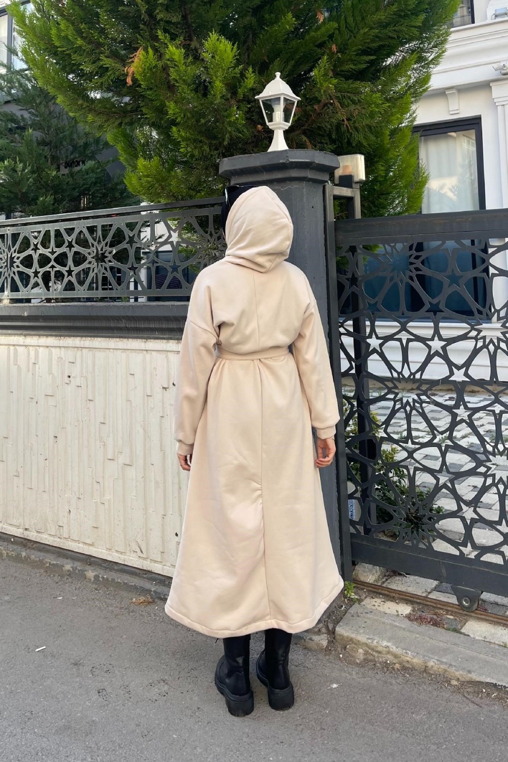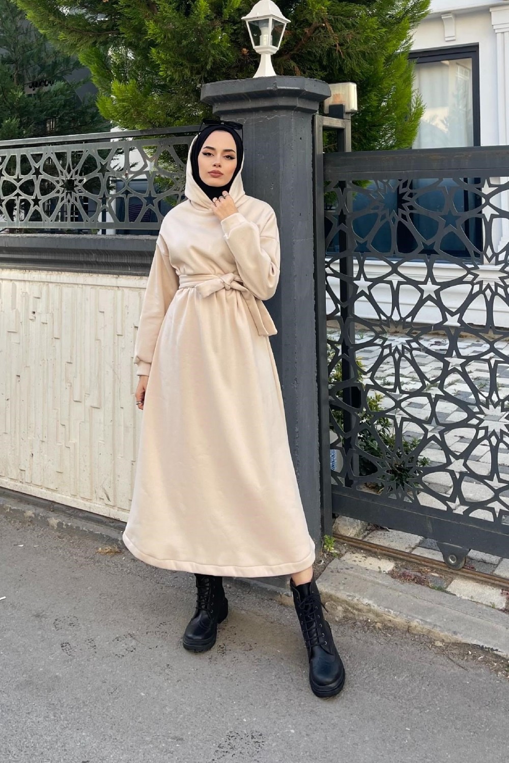 Üç İplik Kapşonlu Elbise Bej