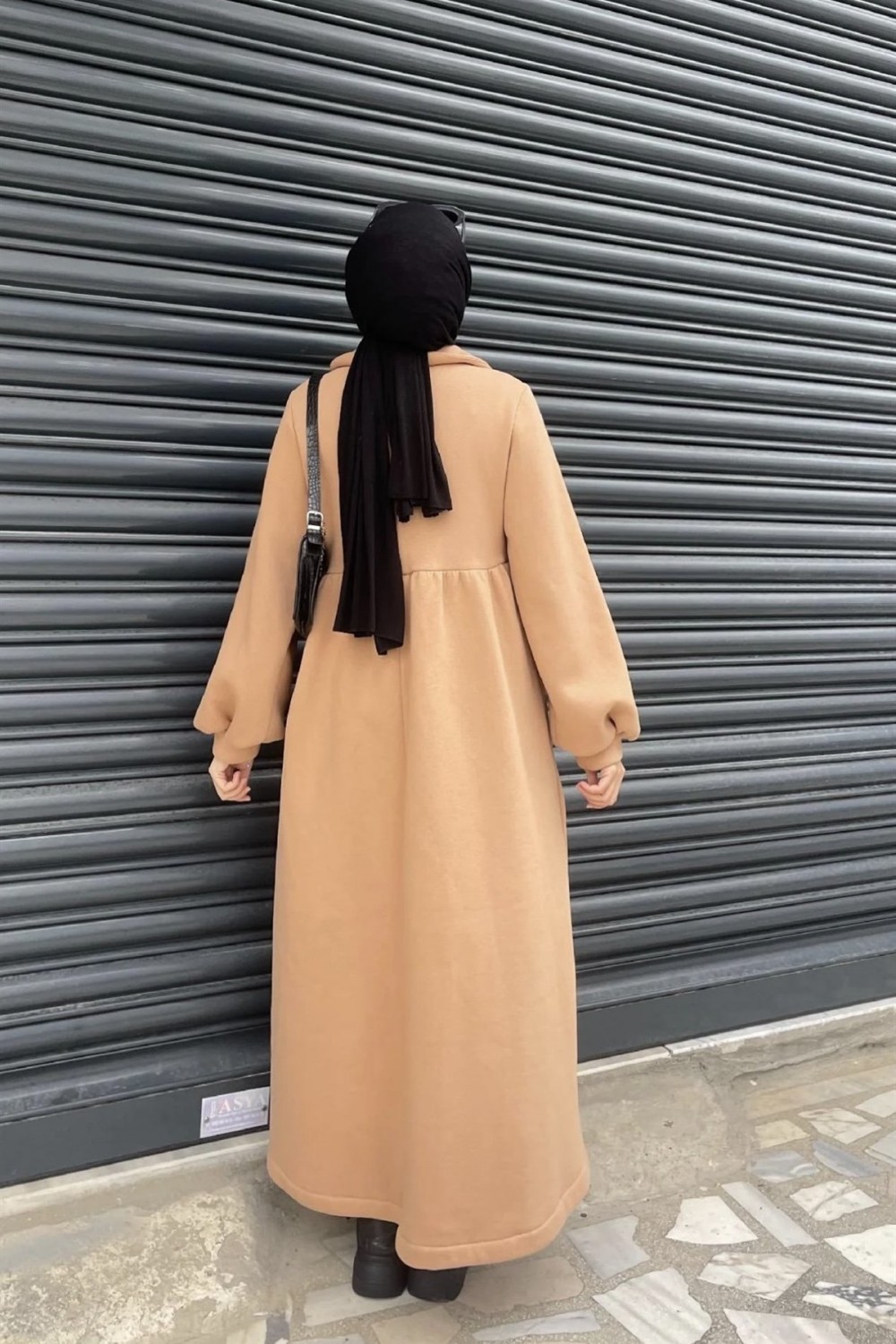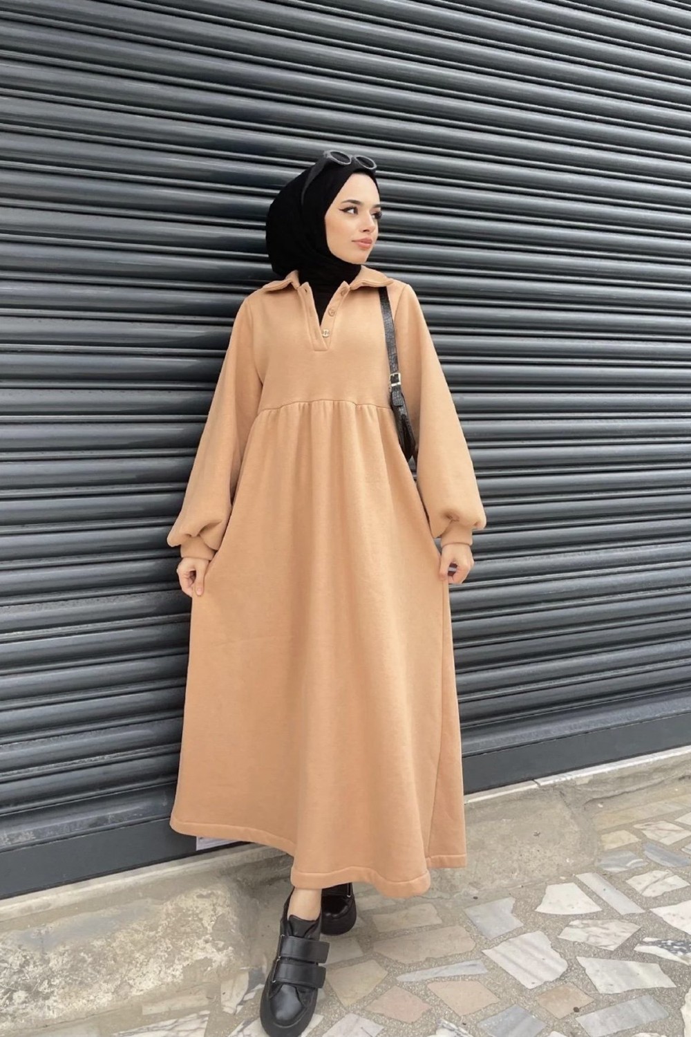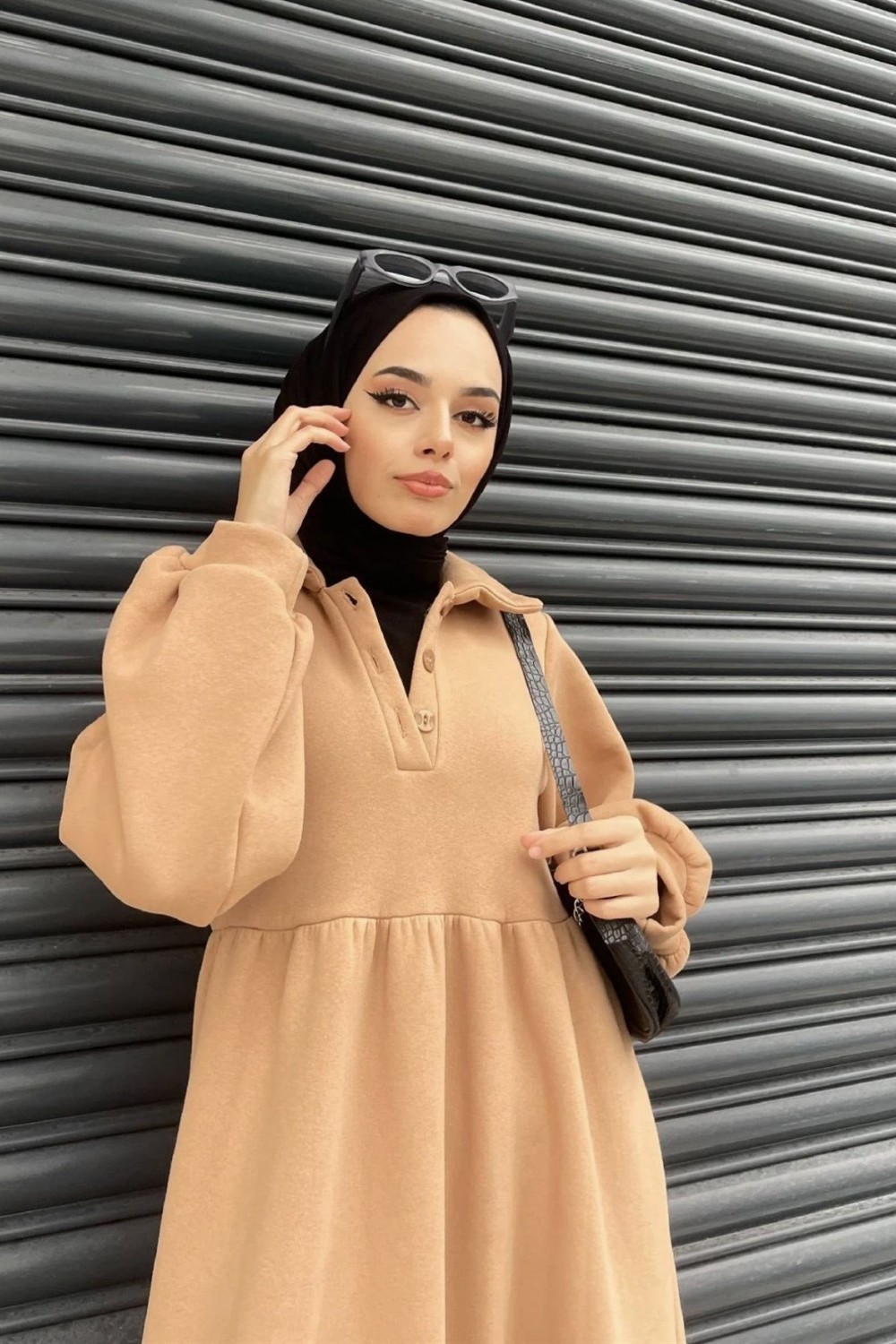 Önden Düğmeli Üç İplik Elbise SütlüKahve
