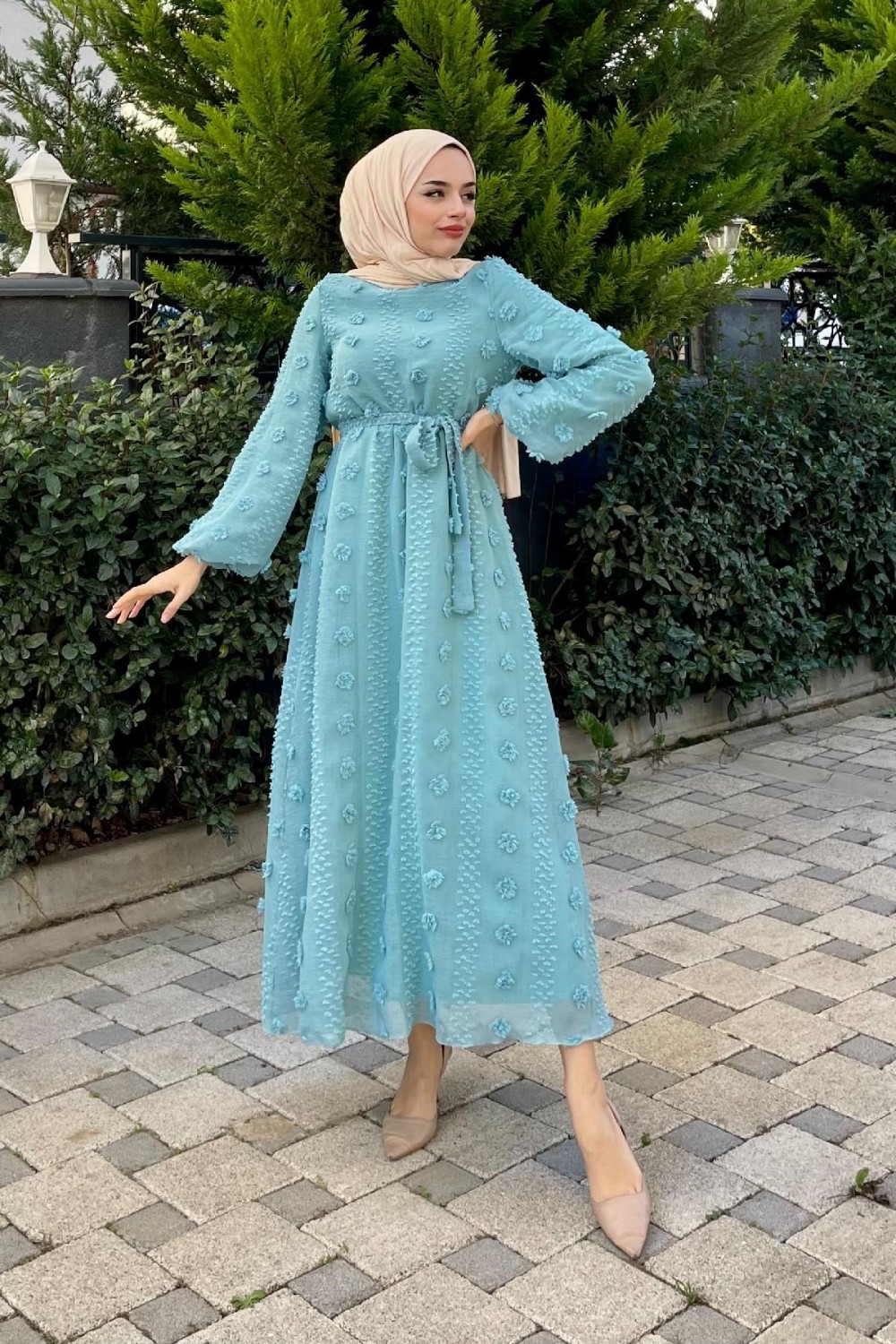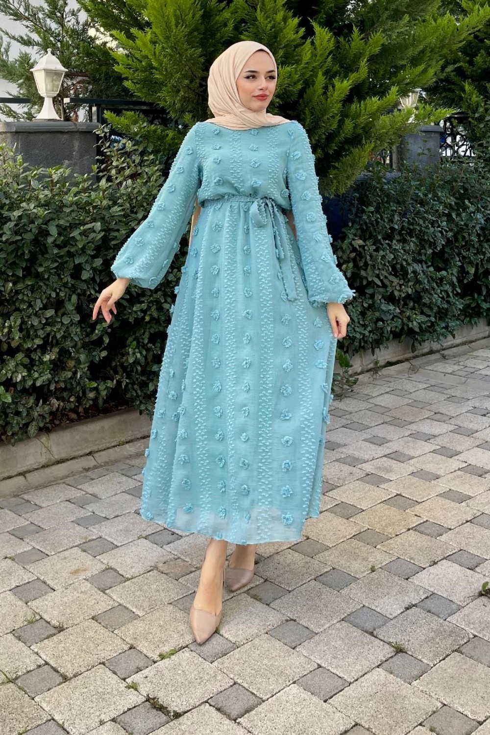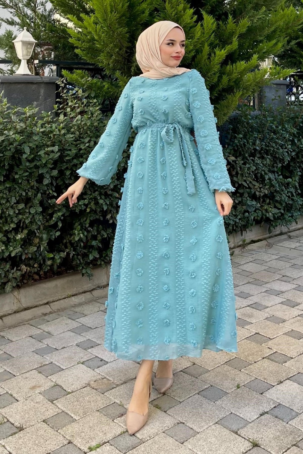 Beli Lastikli Ponpon Elbise Mavi